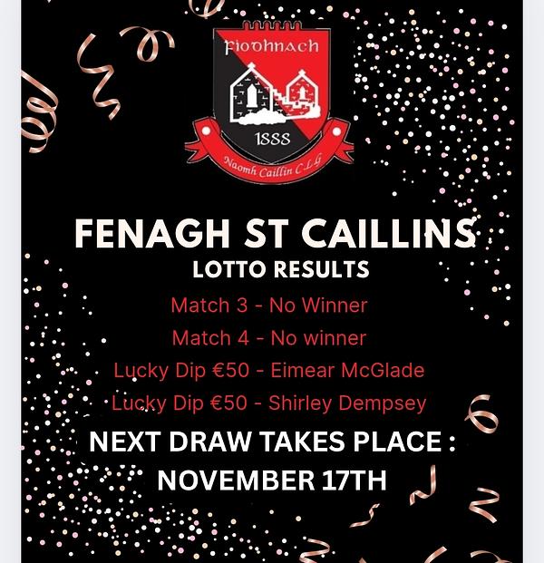 Club Lotto: There was no winner of our €3000 or €5000 Jackpot tonight. Congratulations to our 2 lucky dip winners Eimear McGlade and Shirley Dempsey who win €50 each. Our next draw takes place Monday 17th November.