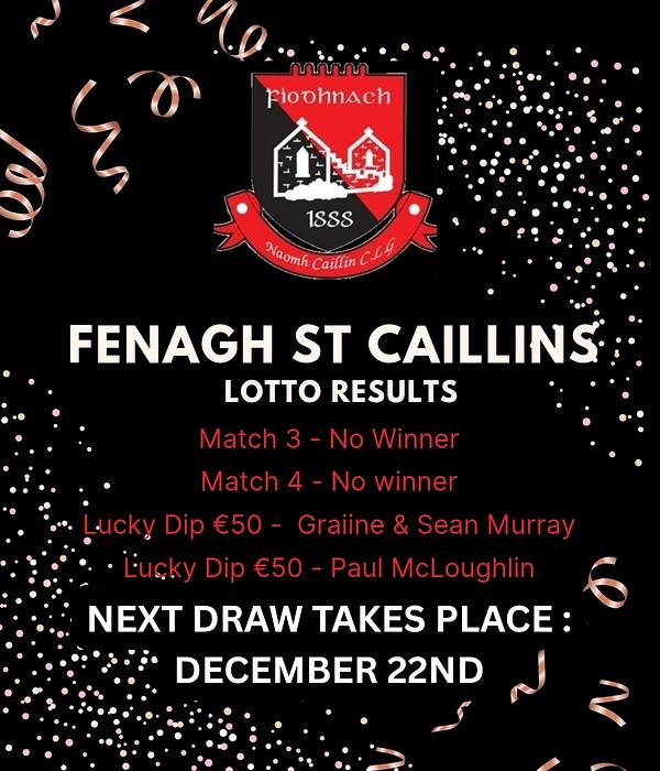 Club Lotto: There was no winner of our €3000 or €5000 Jackpot tonight. Congratulations to our 2 lucky dip winners Grainne & Sean Murray and Paul McLoughlin who win €50 each. (The numbers drawn for Match 3 were 13, 9, 27 and Match 4 were 2, 26, 14 & 23 ). Our next draw takes place Monday 22nd December.