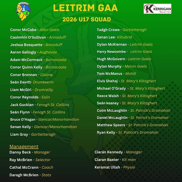 Leitrim U17 Football managers Danny Beck and Ciarán Kennedy and their management team have announced their panel for the upcoming season.
